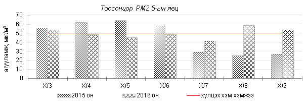 Улаанбаатар хотын агаарт түгээмэл бохирдуулах бодис хүхэрлэг хий /SO2/, азотын давхар исэл /NO2/, тоосонцор /PM10, PM2.5/, нүүрстөрөгчийн дутуу исэл /CO/, озон /O3/-ы агууламжийг тодорхойллоо.