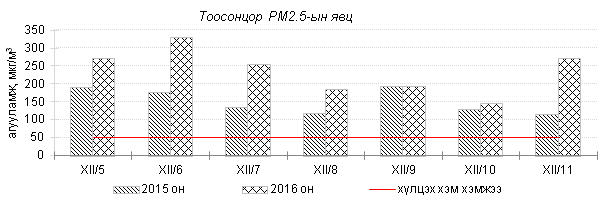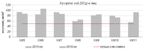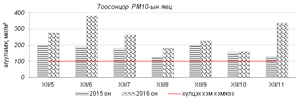 Улаанбаатар хотын агаарт түгээмэл бохирдуулах бодис хүхэрлэг хий /SO2/, азотын давхар исэл /NO2/, тоосонцор /PM10, PM2.5/, нүүрстөрөгчийн дутуу исэл /CO/, озон /O3/-ы агууламжийг тодорхойллоо.