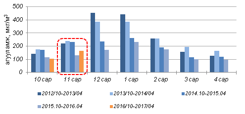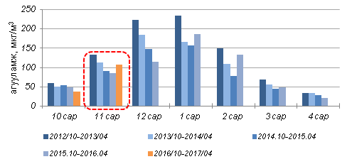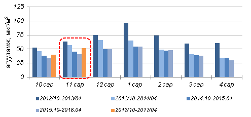 Зураг 4. Хүйтний улирлын хүхэрлэг хийн сарын дундаж агууламж, 2012-2016он