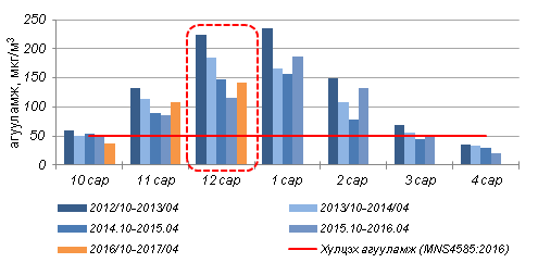 12 дугаар сард 24 цагийн дунджийн хамгийн их агууламж Зурагт орчимд 286мкг/м3 хүрсэн нь АЧС дахь ХА-тай харьцуулахад 5.7 дахин их байна.