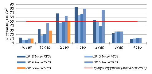 Зураг 4. Хүйтний улирлын хүхэрлэг хийн сарын дундаж агууламж, 2012-2016он