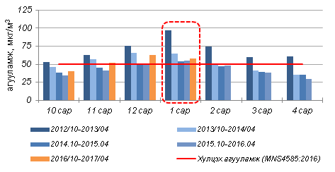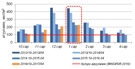 Хүхэрлэг хийн 24 цагийн дундаж агууламжийг 2017 оны 1 дүгээр сард нийт 14 цэгт 400 удаа тодорхойлсноос 245 удаад нь 61%-д нь АЧС дахь ХА-аас давсан тохиолдол ажиглагджээ. 24 цагийн дунджийн хамгийн их агууламж Зурагт орчимд 270мкг/м3 хүрсэн нь АЧС дахь ХА-тай харьцуулахад 5.4 дахин их байна.