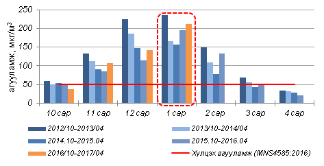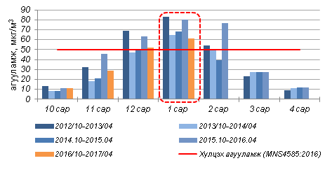 Зураг 4. Хүйтний улирлын хүхэрлэг хийн сарын дундаж агууламж, 2012-2017он