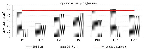 Улаанбаатар хотын агаарт түгээмэл бохирдуулах бодис хүхэрлэг хий /SO2/, азотын давхар исэл /NO2/, тоосонцор /PM10, PM2.5/, нүүрстөрөгчийн дутуу исэл /CO/, озон /O3/-ы агууламжийг тодорхойллоо.