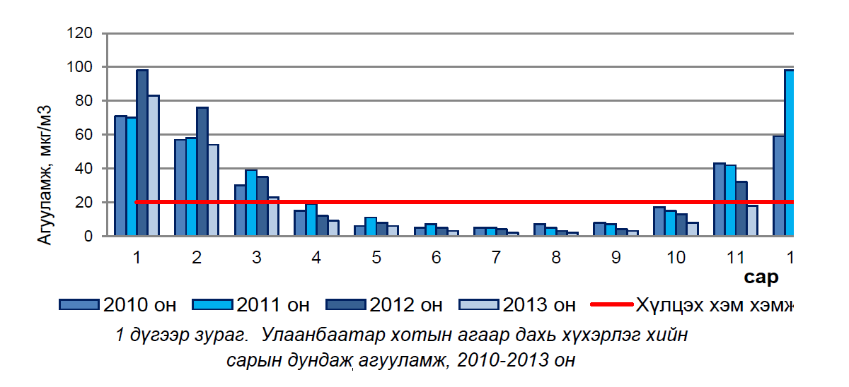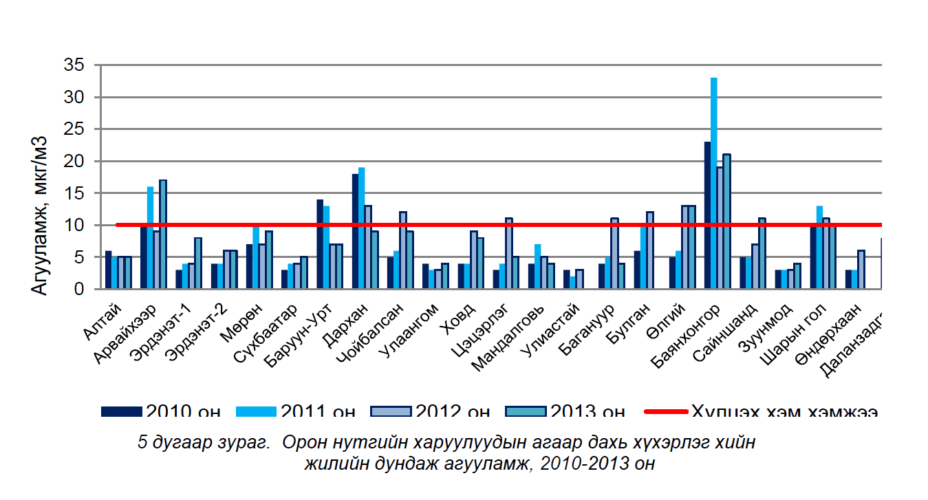 2013 онд хийсэн агаар бохирдуулах бодисын жилийн дундаж агууламжийг АЧС дахь ХХХ-тэй харьцуулахад хүхэрлэг хийн агууламж 22 мкг/м3-д буюу 2.2 дахин, том ширхэглэгт тоосонцрын агууламж 195 мкг/м3-д буюу 3.9 дахин, нарийн ширхэглэгт тоосонцрын агууламж 84 мкг/м3 буюу 3.4 дахин, азотын давхар ислийн агууламж 59 мкг/м3 буюу 2.0 дахин тус тус их байсан байна. Доорх зургуудад агаар бохирдуулах бодисын явцыг 2010-2013 оноор харьцуулж харууллаа.