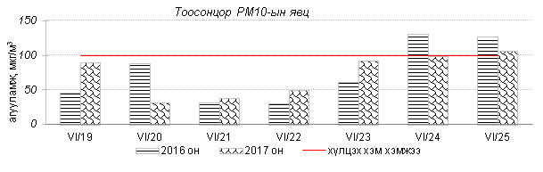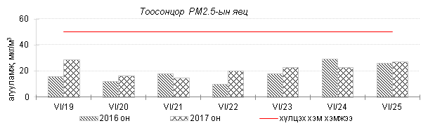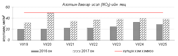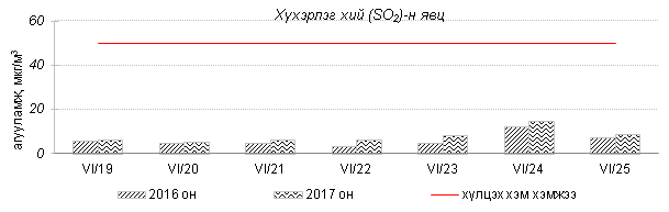 Улаанбаатар хотын агаарт түгээмэл бохирдуулах бодис хүхэрлэг хий /SO2/, азотын давхар исэл /NO2/, тоосонцор /PM10, PM2.5/, нүүрстөрөгчийн дутуу исэл /CO/, озон /O3/-ы агууламжийг тодорхойллоо.