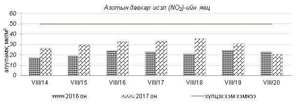 Өнгөрсөн 7 хоногийн агаарын чанарын хяналт шинжилгээний дүнгээр томоохон автозамуудын орчимд агаар “Бага” зэргийн бохидолтой бусад хэсэгт агаар “Хэвийн” болон “Цэвэр” түвшинд байсан байна. Агаар дахь гол бохирдуулах бодис нь NO2 азотын давхар исэл, PM10 тоосонцор, O3 озон байна. Дэлгэрэнгүй мэдээг хавсралтаас үзнэ үү.