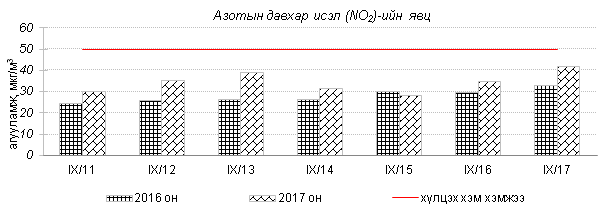 Өнгөрсөн 7 хоногийн агаарын чанарын хяналт шинжилгээний дүнгээр Улаанбаатар хотын хэмжээнд агаар “Хэвийн” болон “Бага” зэргийн бохирдолтой байсан ба гэр хорооллын зарим хэсэгт “Дунд” зэргийн бохирдол илэрч байна. Агаар дахь гол бохирдуулах бодис нь азотын давхар исэл (NO2), PM10 тоосонцор байна. Дэлгэрэнгүй мэдээг хавсралтаас үзнэ үү.
