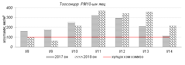 Өнгөрсөн 7 хоногийн агаарын чанарын хяналт шинжилгээний дүнгээр агаарын бохирдол 7 хоногийн сүүлээр илүү ажиглагдаж Улаанбаатар хотын гэр хороолол орчим “Их” болон “Маш их” бохирдолтой түвшинд хүрч 2017 оны мөн үетэй харьцуулахад агаар дахь PM2.5, PM10 тоосонцрын агууламж 12-14%-иар их, хүхэрлэг хийн агууламж 31%-иар бага байна. PM2.5, PM10 тоосонцор, хүхэрлэг хийн 24 цагийн дундаж агууламжийн хамгийн их нь агаарын чанарын стандартаас 4-14 дахин их байна. Дэлгэрэнгүй мэдээг хавсралтаас үзнэ үү.