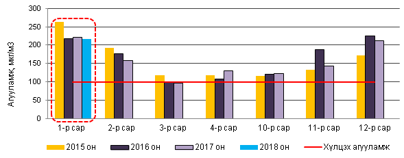 Улаанбаатар хотын агаар дахь PM10 тоосонцрын 2018 оны 1 дүгээр сарын дундаж агууламжийг 2017 оны мөн үетэй харьцуулахад 4мкг/м3-ээр буюу 1.8%-иар бага, Агаарын чанарын стандарт дахь Хүлцэх агууламж /цаашид АЧС дахь ХА гэх/-тай харьцуулахад 2.2 дахин их байна (Зураг 1).