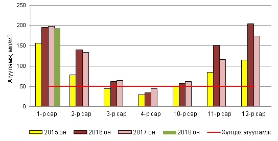 Агаар дахь азотын давхар ислийн 2018 оны 1 дүгээр сарын дундаж агууламжийг 2017 оны мөн үетэй харьцуулахад 10мкг/м3-ээр буюу 16%-иар бага, АЧС дахь ХА-тай харьцуулахад 1.1 дахин их байна (Зураг 4).