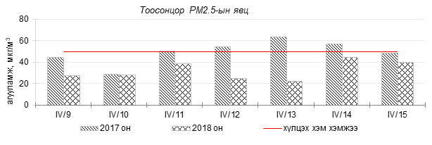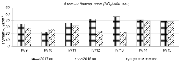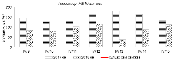 Өнгөрсөн 7 хоногийн агаарын чанарын хяналт шинжилгээний дүнгээр Улаанбаатар хотын хэмжээнд агаарын чанар ихэнх өдрүүдэд “Хэвийн” болон “Бага” зэргийн бохирдолтой байсан байна. 4 дүгээр сарын 13-нд 7-9 мм хэмжээний тунадас орсонтой холбоотойгоор агаар дахь PM2.5, PM10 тоосонцрын 7 хоногийн дундаж агууламж 2017 оны мөн үетэй харьцуулахад 36-42%-иар бага байсан бол 24 цагийн дундаж хамгийн их агууламж агаарын чанарын стандартаас 1.3-1.8 дахин их байна. Дэлгэрэнгүй мэдээг хавсралтаас үзнэ үү.