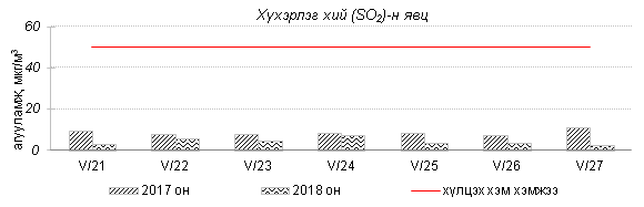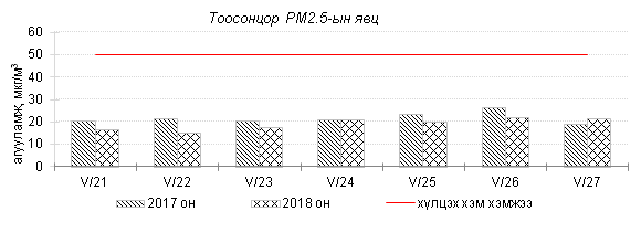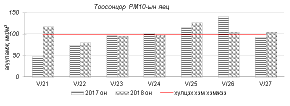 Өнгөрсөн 7 хоногийн агаарын чанарын хяналт шинжилгээний дүнгээр Улаанбаатар хотын агаарын чанар ихэнх өдрүүдэд “Бага” зэргийн бохирдолтой байлаа. Агаар дахь хамгийн их бохирдуулах бодис PM10 тоосонцор байсан ба 7 хоногийн дундаж агууламж 2017 оны мөн үетэй харьцуулахад 8.6%-иар их, 24 цагийн дундаж хамгийн их агууламж агаарын чанарын стандартаас 2.2 дахин их байна. Дэлгэрэнгүйг эндээс үзнэ үү.