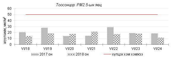 Өнгөрсөн 7 хоногийн агаарын чанарын хяналт шинжилгээний дүнгээр Улаанбаатар хотын төв автозамын дагуу Баруун 4 зам, 13-р хороолол орчим болон бүтээн байгуулалтын ажилтай холбоотойгоор 100 айл, Баянхошуу орчим PM10 тоосонцор, азотын давхар исэл “Бага зэргийн бохирдолтой” түвшинд хүрсэн байна. Хамгийн их бохирдолтой PM10 тоосонцрын 7 хоногийн дундаж агууламжийг өмнөх оны мөн үетэй харьцуулахад ижил түвшинд, харин 24 цагийн дундаж хамгийн их агууламж агаарын чанарын стандартаас 2.1 дахин их байлаа. Дэлгэрэнгүйг эндээс үзнэ үү.