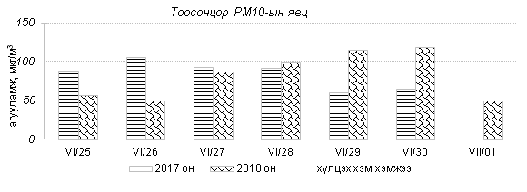 Өнгөрсөн 7 хоногийн агаарын чанарын хяналт шинжилгээний дүнгээр Улаанбаатар хотын төв автозамын дагуу Баруун 4 зам, 13-р хороолол орчим болон бүтээн байгуулалтын ажилтай холбоотойгоор 100 айл, Баянхошуу орчим PM10 тоосонцор, азотын давхар исэл “Бага зэргийн бохирдолтой” түвшинд хүрсэн байна. Хамгийн их бохирдолтой PM10 тоосонцрын 7 хоногийн дундаж агууламжийг өмнөх оны мөн үетэй харьцуулахад 8 хувиар бага түвшинд, харин 24 цагийн дундаж хамгийн их агууламж агаарын чанарын стандартаас 2.7 дахин их байлаа. Дэлгэрэнгүйг эндээс үзнэ үү.