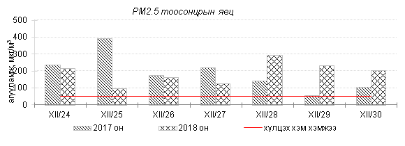 Өнгөрсөн 7 хоногийн агаарын чанарын хяналт шинжилгээний дүнгээр Улаанбаатар хотын гэр хороолол орчим бусад цэгээс хамгийн их бохирдол илэрч агаарын чанарын индексээр “Их бохирдолтой”, “Маш их бохирдолтой” түвшинд хүрсэн байна. Агаарт PM2.5, PM10 тоосонцрын агууламж хамгийн их байсан бөгөөд эдгээр тоосонцрын 24 цагийн дундаж хамгийн их агууламж Агаарын чанарын стандартаас 2-16 дахин их байлаа. Дэлгэрэнгүйг эндээс үзнэ үү.