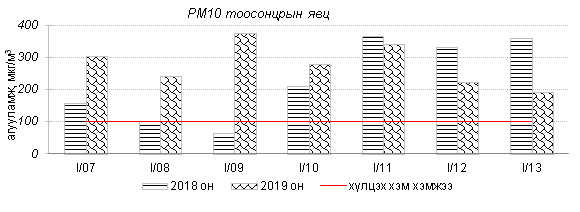 Өнгөрсөн 7 хоногийн агаарын чанарын хяналт шинжилгээний дүнгээр Улаанбаатар хотын гэр хороолол орчимд бусад цэгээс хамгийн их бохирдол илэрч агаарын чанарын индексээр “Их бохирдолтой”, “Маш их бохирдолтой” түвшинд хүрсэн байна. Агаарт PM2.5, PM10 тоосонцрын агууламж хамгийн их байсан бөгөөд эдгээр тоосонцрын 24 цагийн дундаж хамгийн их агууламж Агаарын чанарын стандартаас 9-15 дахин их байлаа. Дэлгэрэнгүйг эндээс үзнэ үү.