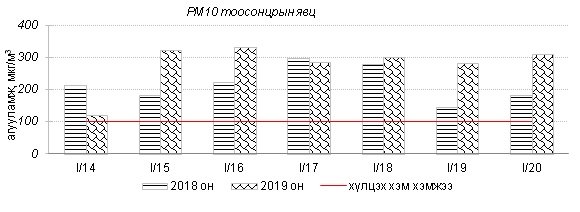 Өнгөрсөн 7 хоногийн агаарын чанарын хяналт шинжилгээний дүнгээр Улаанбаатар хотын гэр хороолол орчимд бусад цэгээс хамгийн их бохирдол илэрч агаарын чанарын индексээр “Их бохирдолтой”, “Маш их бохирдолтой” түвшинд хүрсэн байна. Агаарт PM2.5, PM10 тоосонцрын агууламж хамгийн их байсан бөгөөд эдгээр тоосонцрын 24 цагийн дундаж хамгийн их агууламж Агаарын чанарын стандартаас 7-12 дахин их байлаа. Дэлгэрэнгүйг эндээс үзнэ үү.