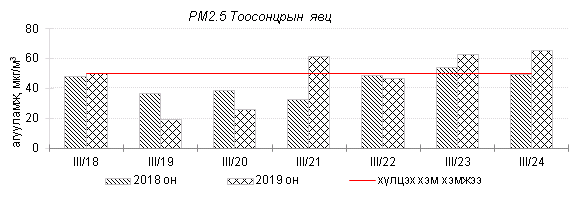 Өнгөрсөн 7 хоногийн агаарын чанарын хяналт шинжилгээний дүнгээр Улаанбаатар хотын хэмжээнд агаар “Бага бохирдолтой” түвшинд байсан байна. Хамгийн их агууламж Нисэх, Амгалан, Бөхийн өргөө орчимд ажиглагдсан ба Агаарт PM2.5, PM10 тоосонцрын агууламж  хамгийн их байсан бөгөөд тоосонцрын 24 цагийн дундаж хамгийн их агууламж Агаарын чанарын стандартаас 2.1-2.5 дахин их байлаа. Дэлгэрэнгүйг эндээс үзнэ үү.