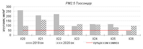 Өнгөрсөн 7 хоногийн агаарын чанарын хяналт шинжилгээний дүнгээр Улаанбаатар хотын хэмжээнд агаарын чанар ихэнх өдрүүдэд “Бага бохирдолтой” байсан ба агаар дахь PM2.5 тоосонцор 1-р хороолол, Зурагт орчимд “Бохирдолтой” түвшинд хүрч, бусад цэгээс их агууламжтай байсан байна. Дэлгэрэнгүй мэдээг хавсралтаас үзнэ үү.