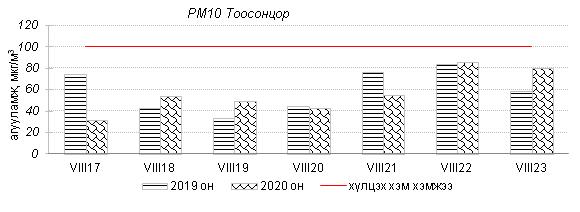 Улаанбаатар хотын агаарт түгээмэл бохирдуулах бодис хүхэрлэг хий /SO2/, азотын давхар исэл /NO2/, тоосонцор /PM10, PM2.5/, нүүрстөрөгчийн дутуу исэл /CO/, озон /O3/-ны агууламжийг тодорхойллоо.
