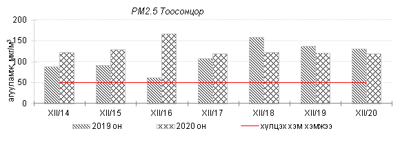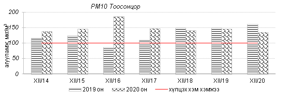Улаанбаатар хотын агаарт түгээмэл бохирдуулах бодис хүхэрлэг хий /SO2/, азотын давхар исэл /NO2/, тоосонцор /PM10, PM2.5/, нүүрстөрөгчийн дутуу исэл /CO/, озон /O3/-ны агууламжийг тодорхойллоо.