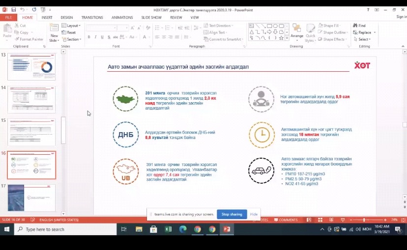 Тээврийн хэрэгслээс үүдэлтэй агаарын бохирдлыг бууруулахад төрийн байгууллагуудын хамтын ажиллагааны зөвлөлдөх уулзалтыг 2021 оны гуравдугаар сарын 19-ны өдөр  цахимаар хийлээ.