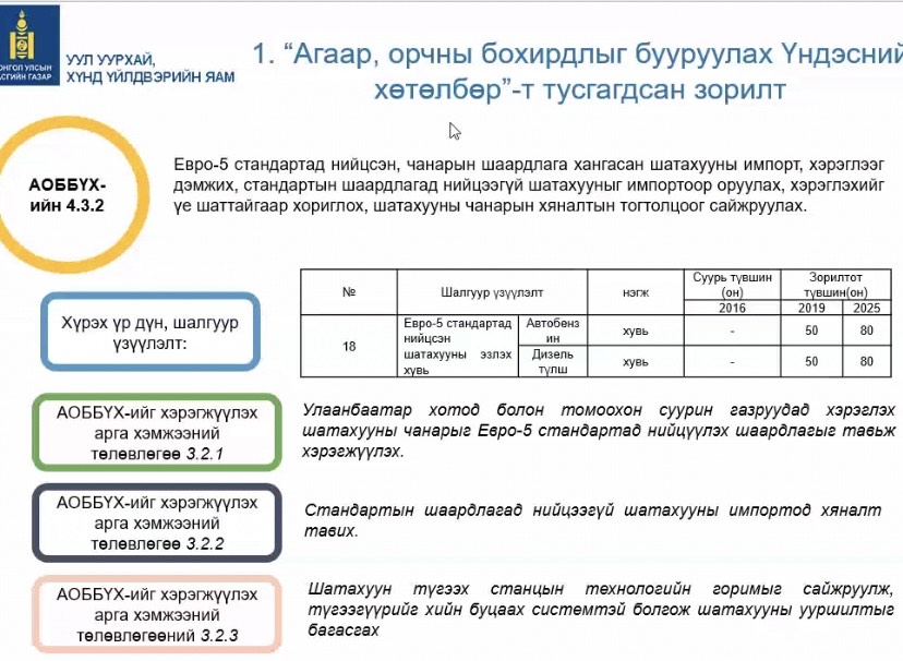 Мөн “Евро-5 /К5/ стандартын шатахууны хэрэглээг дэмжсэн эрх зүйн орчныг  бүрдүүлэх, татварын бодлогоор дэмжих боломжийн талаар УУХҮЯ-ны ахлах шинжээч Д.Даваабаяр, Автобензин дизелийн түлшинд мөрдөж буй стандартын өнөөгийн нөхцөл байдал, автомашинаас ялгарах утаанд үзүүлэх нөлөөллийн талаар АМГТГ-ын шинжээч Д.Дагвасүрэн болон мэргэжлийн төлөөллүүд оролцож мэдээлэл туршлагаа солилцож тээврийн хэрэгслээс үүдэлтэй агаарын бохирдлыг бууруулах хамтын ажиллагааны шийдэл гаргахаар боллоо.