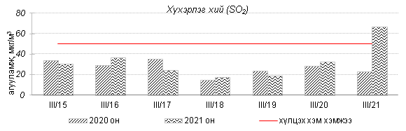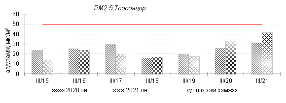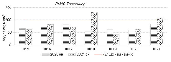 Улаанбаатар хотын агаарт түгээмэл бохирдуулах бодис хүхэрлэг хий /SO2/, азотын давхар исэл /NO2/, тоосонцор /PM10, PM2.5/, нүүрстөрөгчийн дутуу исэл /CO/, озон /O3/-ы агууламжийг тодорхойллоо.