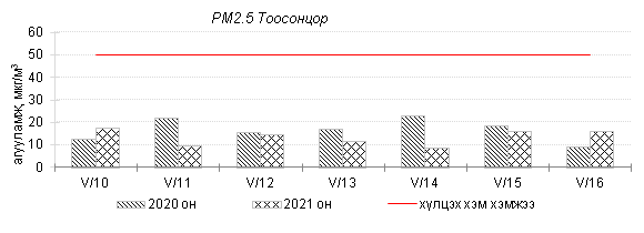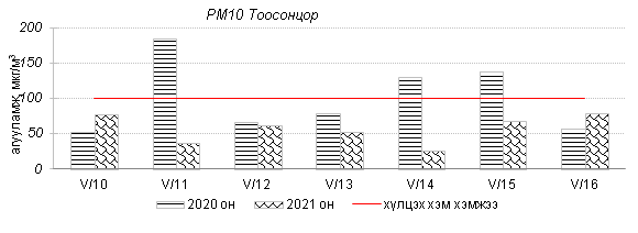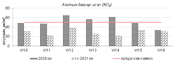 Улаанбаатар хотын агаарт түгээмэл бохирдуулах бодис хүхэрлэг хий /SO2/, азотын давхар исэл /NO2/, тоосонцор /PM10, PM2.5/, нүүрстөрөгчийн дутуу исэл /CO/, озон /O3/-ы агууламжийг тодорхойллоо.