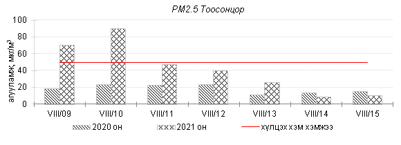 Өнгөрсөн 7 хоногийн агаарын чанарын хяналт шинжилгээний дүнгээр Улаанбаатар хотын агаарын чанар 8 дугаар сарын 9-өөс 12-ны өдрүүдэд бага бохирдолтой түвшинд байсан ба бусад өдөр хэвийн болон цэвэр түвшинд байлаа. Дэлгэрэнгүй мэдээг хавсралтаас үзнэ үү.