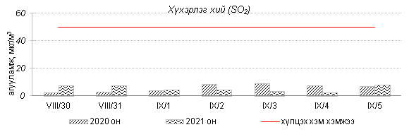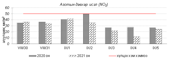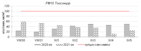Өнгөрсөн 7 хоногийн агаарын чанарын хяналт шинжилгээний дүнгээр Улаанбаатар хотод 100-н айл, Баруун 4-н зам, Амгалан, Цахилгаан станц орчим 8 дугаар сарын 30-аас 9 дүгээр сарын 02-ны өдрүүдэд бага бохирдолтой, бусад үед “Цэвэр” болон “Хэвийн” түвшинд байна. Дэлгэрэнгүйг эндээс үзнэ үү.