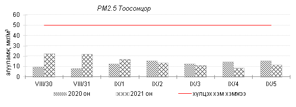 Улаанбаатар хотын агаарт түгээмэл бохирдуулах бодис хүхэрлэг хий /SO2/, азотын давхар исэл /NO2/, тоосонцор /PM10, PM2.5/, нүүрстөрөгчийн дутуу исэл /CO/, озон /O3/-ы агууламжийг тодорхойллоо.