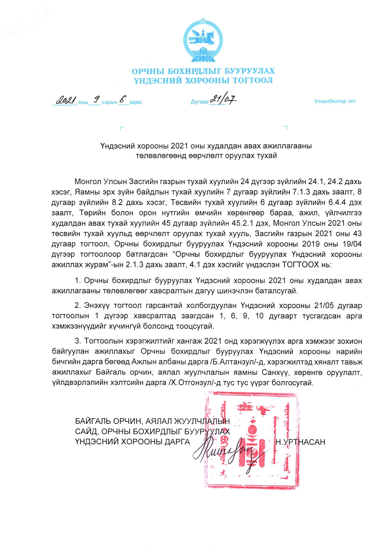Үндэсний хорооны 2021 онд худалдан авах үйл ажиллагааны төлөвлөгөөнд өөрчлөлт оруулах тухай /2021.09.06-ны 21/07/