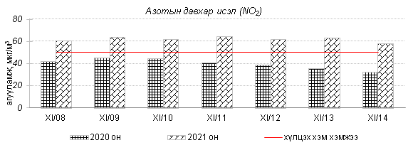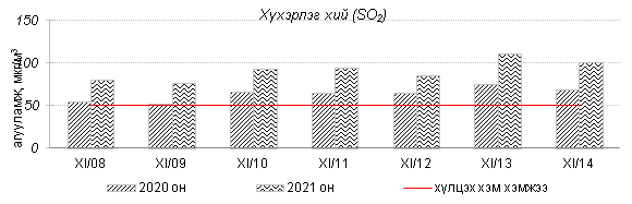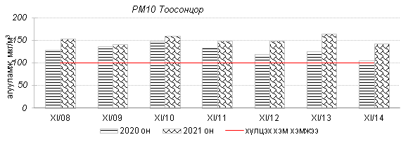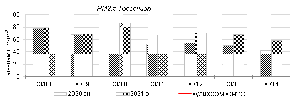 Улаанбаатар хотын агаарт түгээмэл бохирдуулах бодис хүхэрлэг хий /SO2/, азотын давхар исэл /NO2/, тоосонцор /PM10, PM2.5/, нүүрстөрөгчийн дутуу исэл /CO/, озон /O3/-ы агууламжийг тодорхойллоо.