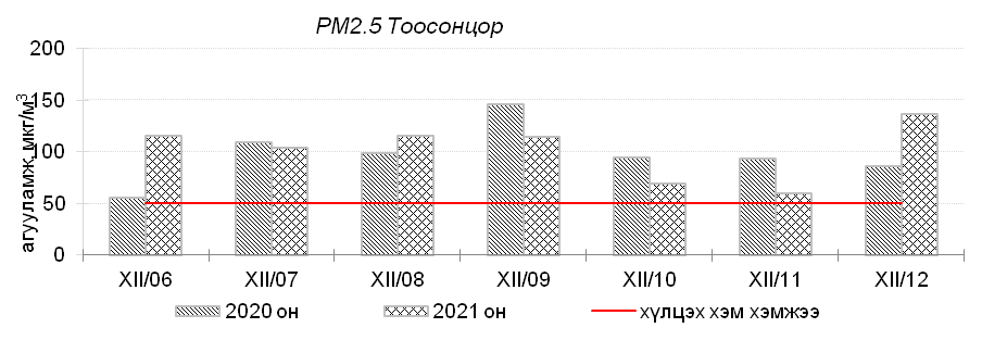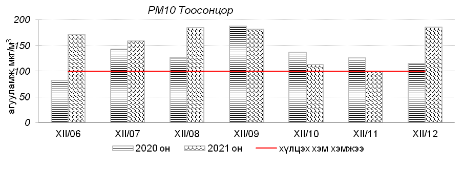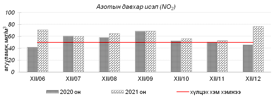 Улаанбаатар хотын агаарт түгээмэл бохирдуулах бодис хүхэрлэг хий /SO2/, азотын давхар исэл /NO2/, тоосонцор /PM10, PM2.5/, нүүрстөрөгчийн дутуу исэл /CO/, озон /O3/-ы агууламжийг тодорхойллоо.