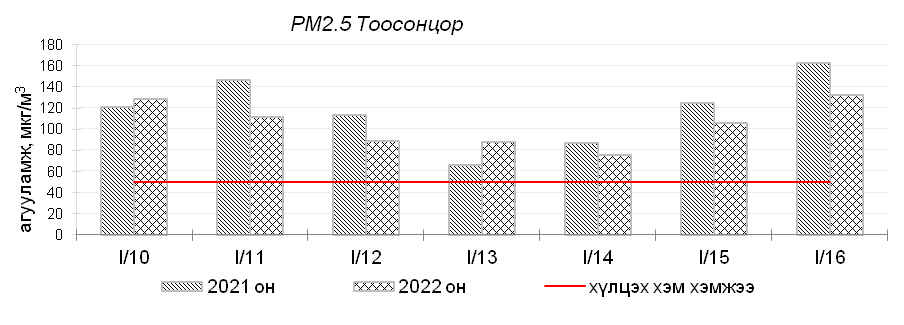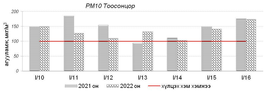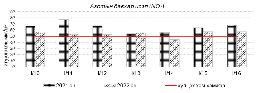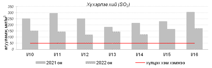 Улаанбаатар хотын агаарт түгээмэл бохирдуулах бодис хүхэрлэг хий /SO2/, азотын давхар исэл /NO2/, тоосонцор /PM10, PM2.5/, нүүрстөрөгчийн дутуу исэл /CO/, озон /O3/-ы агууламжийг тодорхойллоо.