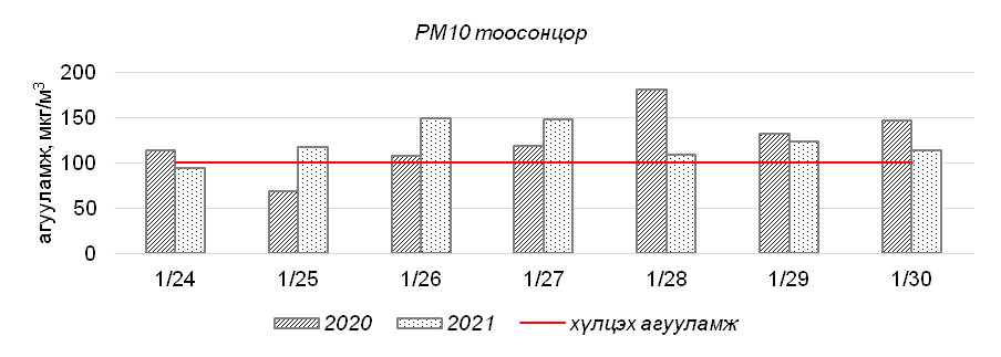 Улаанбаатар хотын агаарт түгээмэл бохирдуулах бодис хүхэрлэг хий /SO2/, азотын давхар исэл /NO2/, тоосонцор /PM10, PM2.5/, нүүрстөрөгчийн дутуу исэл /CO/, озон /O3/-ы агууламжийг тодорхойллоо.