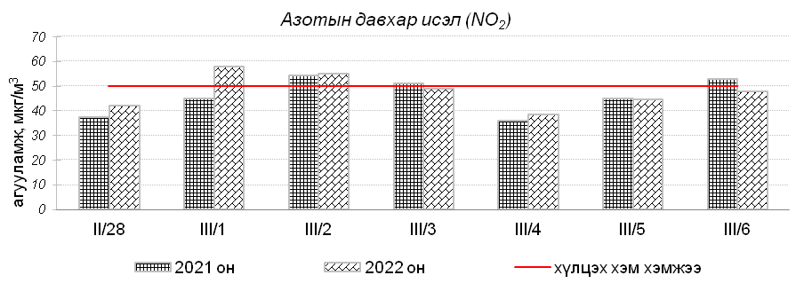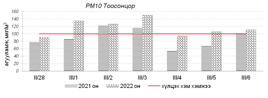Улаанбаатар хотын агаарт түгээмэл бохирдуулах бодис хүхэрлэг хий /SO2/, азотын давхар исэл /NO2/, тоосонцор /PM10, PM2.5/, нүүрстөрөгчийн дутуу исэл /CO/, озон /O3/-ы агууламжийг тодорхойллоо.