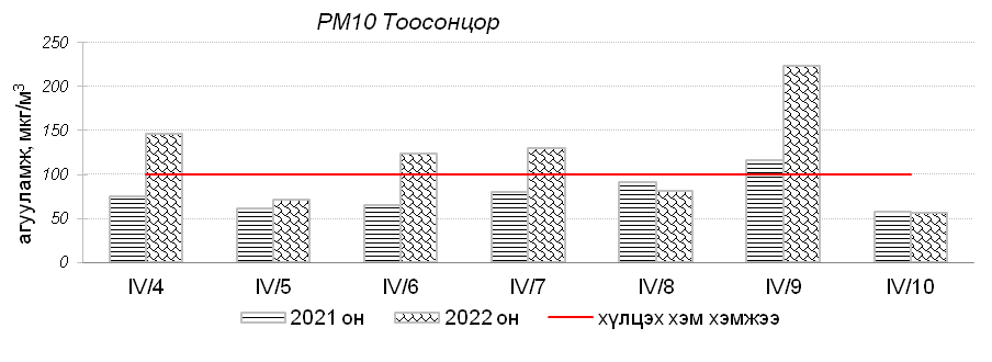 Өнгөрсөн 7 хоногийн агаарын чанарын хяналт шинжилгээний дүнгээр Улаанбаатар хотын агаарын чанар Толгойт, Мишээл экспо, Зайсан, Ургах наран хороолол орчим “Цэвэр” болон “Хэвийн ”, бусад цэгүүдэд “Бага бохирдолтой” түвшинд байсан байна. /4 дүгээр сарын 09-ний өдөр салхины хурд 18 м/с хүрч Баянхошуу орчим РМ10 тоосонцрын агууламж “Маш их бохирдолтой” түвшинд хүрсэн/. Дэлгэрэнгүйг эндээс үзнэ үү.