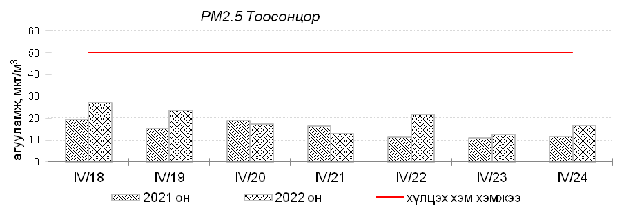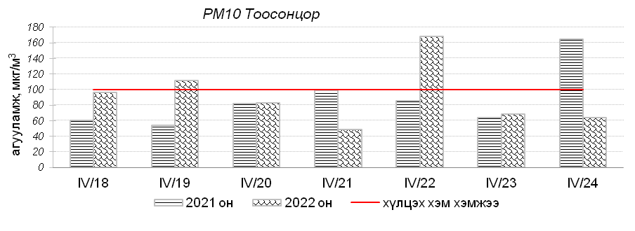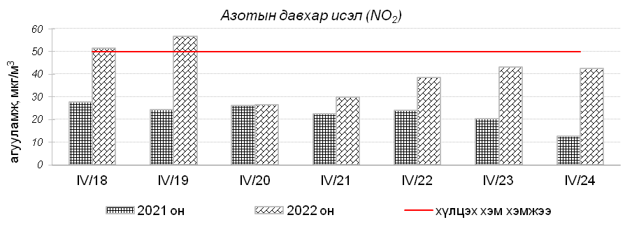 Улаанбаатар хотын агаарт түгээмэл бохирдуулах бодис хүхэрлэг хий /SO2/, азотын давхар исэл /NO2/, тоосонцор /PM10, PM2.5/, нүүрстөрөгчийн дутуу исэл /CO/, озон /O3/-ы агууламжийг тодорхойллоо.