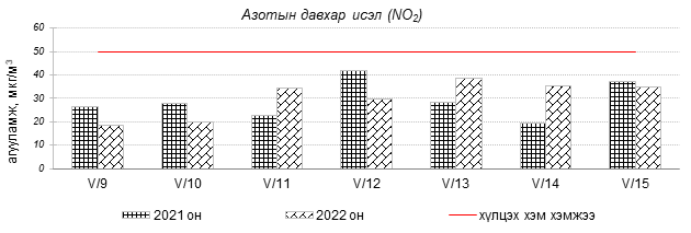 Улаанбаатар хотын агаарт түгээмэл бохирдуулах бодис хүхэрлэг хий /SO2/, азотын давхар исэл /NO2/, тоосонцор /PM10, PM2.5/, нүүрстөрөгчийн дутуу исэл /CO/, озон /O3/-ы агууламжийг тодорхойллоо.