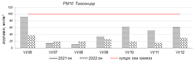 Өнгөрсөн 7 хоногийн агаарын чанарын хяналт шинжилгээний дүнгээр Улаанбаатар хотын агаарын чанар 1-р хороолол, 100-н айл, Толгойт, Нисэх, Хайлааст, 5-н буудал, 13-р хороолол, Цахилгаан станц, Мишээл экспо, Зайсан, Ургах наран хороолол орчим “Цэвэр” болон “Хэвийн”, Зурагт, Баруун 4-н зам, Амгалан орчим “Бага бохирдолтой” түвшинд байсан байна. Дэлгэрэнгүйг эндээс үзнэ үү.