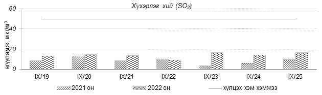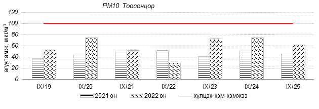 Өнгөрсөн 7 хоног буюу 2022 оны 9 дүгээр сарын 19-өөс 25-ны өдрийн агаарын чанарын хяналт шинжилгээний дүнгээр Улаанбаатар хотын агаарын чанар 1-р хороолол, Толгойт, Нисэх, Хайлааст, 5-н буудал, Шархад, 13-р хороолол, Мишээл экспо, Зайсан, Ургах наран хороолол орчим “Цэвэр” болон “Хэвийн”, зарим өдрүүдэд 100-н айл, Налайх, Баруун 4-н зам, Амгалан, Цахилгаан станц, “Бага бохирдолтой” түвшинд хүрсэн байна. Дэлгэрэнгүйг эндээс үзнэ үү.