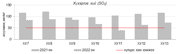 Өнгөрсөн 7 хоногийн буюу 2022 оны 11 дүгээр сарын 07-оос 13-ны өдрийн агаарын чанарын хяналт шинжилгээний дүнгээр Улаанбаатар хотын агаарын чанар Зайсан, Мишээл экспо орчим “Цэвэр” болон “Хэвийн”, Шархад, Налайх, 13-р хороолол, Ургах наран хороолол, 1-р хороолол, 100-н айл, Толгойт, Нисэх, Зурагт, Баянхошуу, Хайлааст, 5-н буудал, Баруун 4-н зам, Амгалан, Цахилгаан станц орчим “Бага бохирдолтой” түвшинд байсан байна. Дэлгэрэнгүйг эндээс үзнэ үү.