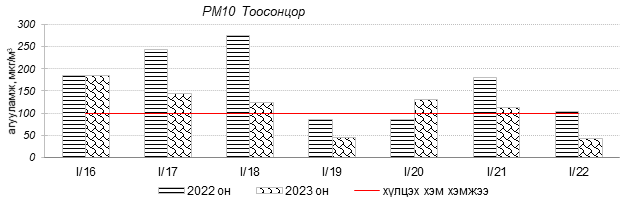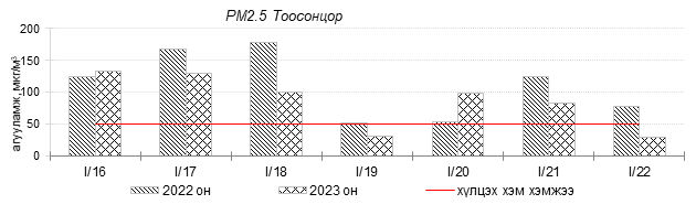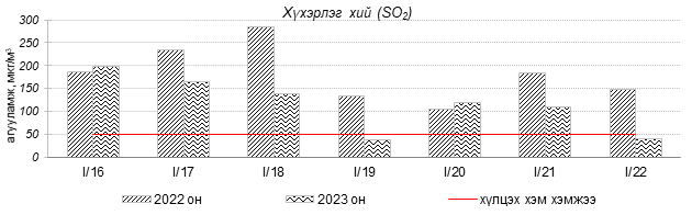 Өнгөрсөн 7 хоногийн агаарын чанарын хяналт шинжилгээний дүнгээр Улаанбаатар хотын агаарын чанар 2023 оны 01 дүгээр сарын 16-22-ны өдрүүдэд 100-н айл, Толгойт, Нисэх, 13-р хороолол, Баруун 4-н зам, Амгалан, Цахилгаан станц, Мишээл экспо, Зайсан, Ургах наран хороолол орчим “Бага бохирдолтой”, 1-р хороолол, Зурагт, Налайх орчим “Бохирдолтой”, Хайлааст, 5-н буудал, Шархад, Баянхошуу орчим “Их бохирдолтой” түвшинд хүрсэн байна. Дэлгэрэнгүйг эндээс үзнэ үү.