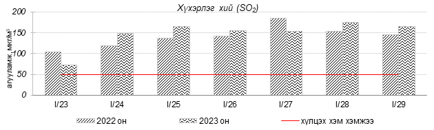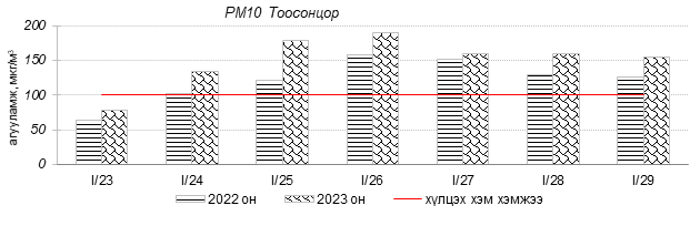 Өнгөрсөн 7 хоногийн агаарын чанарын хяналт шинжилгээний дүнгээр Улаанбаатар хотын агаарын чанар 2023 оны 01 дүгээр сарын 23-29-ний өдрүүдэд 100-н айл, Толгойт, Нисэх, 13-р хороолол, Баруун 4-н зам, Амгалан, Цахилгаан станц, Мишээл экспо, Зайсан, Ургах наран хороолол орчим “Бага бохирдолтой”, 1-р хороолол, Зурагт, 5-н буудал, Шархад, Налайх орчим “Бохирдолтой”, Хайлааст, Баянхошуу орчим “Их бохирдолтой” түвшинд хүрсэн байна. Дэлгэрэнгүйг эндээс үзнэ үү.