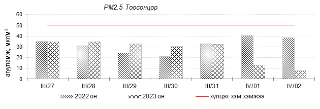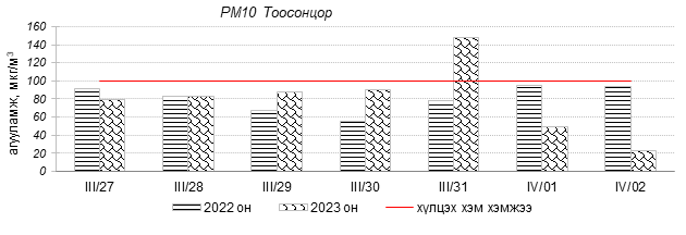 Улаанбаатар хотын агаарын чанар 2023 оны 03 дугаар сарын 27-оос 04 дүгээр сарын 02-ны өдрүүдэд Мишээл экспо, Зайсан, Ургах наран хороолол, Шархад, 5-н буудал, Нисэх орчим цэвэр болон хэвийн, 1-р хороолол, 100-н айл, Толгойт, Зурагт, Хайлааст, 13-р хороолол, Баруун 4-н зам, Налайх, Амгалан, Цахилгаан станц орчим ихэнхдээ “Бага бохирдолтой” түвшинд байсан байна. Дэлгэрэнгүйг эндээс үзнэ үү.