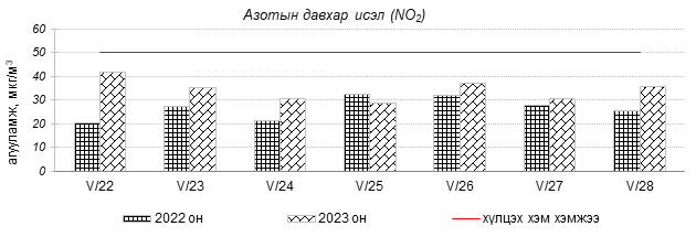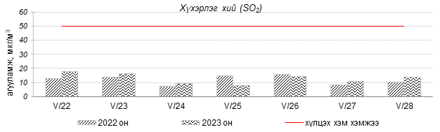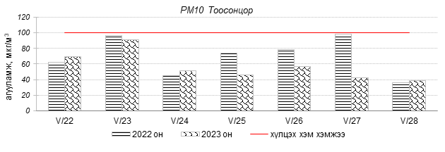 Улаанбаатар хотын агаарын чанар 2023 оны 05 дугаар сарын 22-28-нд Толгойт, Нисэх, Зурагт, Зайсан орчим “Цэвэр”, 1-р хороолол, 100-н айл, Хайлааст, 5-н буудал, Шархад, Налайх, 13-р хороолол, Мишээл экспо, Ургах наран хороолол, Амгалан, Цахилгаан станц “Хэвийн”, Баруун 4-н зам, Баянхошуу орчим “Бага бохирдолтой” түвшинд байсан байна. Дэлгэрэнгүйг эндээс үзнэ үү.