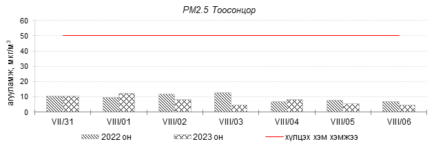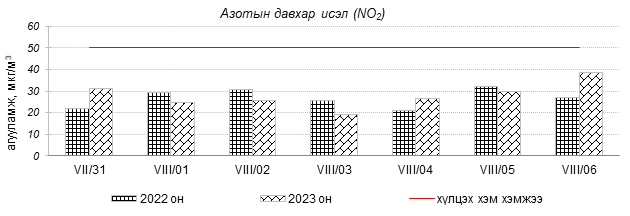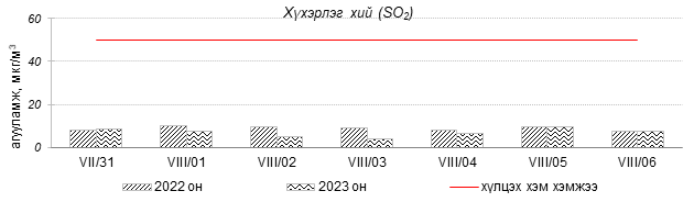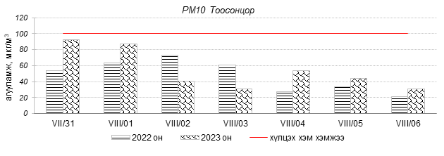 Улаанбаатар хотын агаарын чанар 2023 оны 07 дугаар сарын 31-ээс 08 дугаар сарын 06-ны өдрүүдэд Толгойт, Нисэх, Зурагт, Зайсан , Хайлааст, 5-н буудал, Шархад, Налайх, 1-р хороолол, 13-р хороолол, Мишээл экспо, Ургах наран хороолол, Амгалан, 100-н айл, Цахилгаан станц, Баянхошуу орчим “Цэвэр” болон “Хэвийн”, Баруун 4-н зам орчим “Бага бохирдолтой” түвшинд байсан байна. Дэлгэрэнгүйг эндээс үзнэ үү.